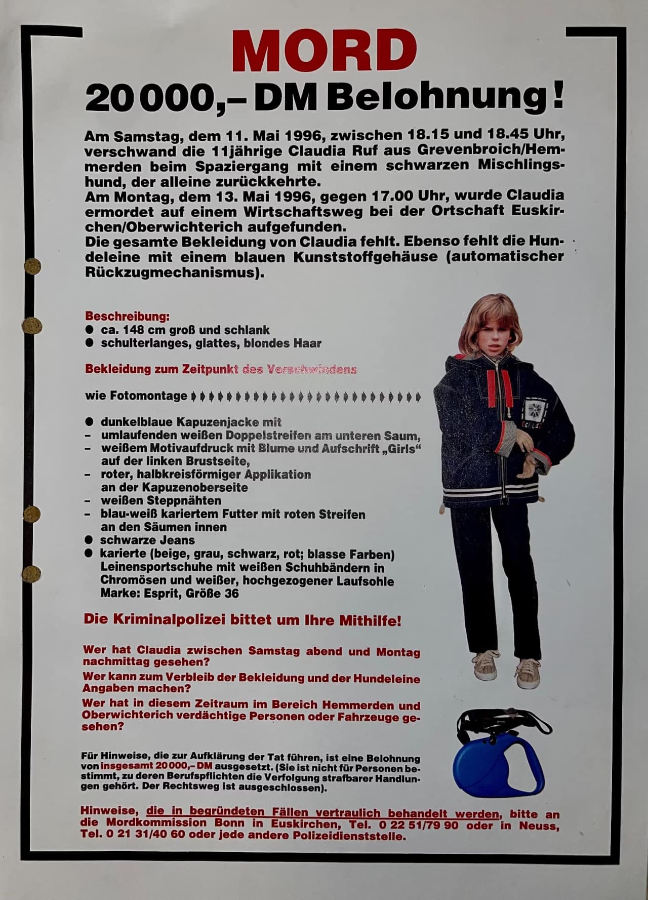 Begonnen haben die Ermittlungen mit der Suche nach Claudia Ruf am 11. Mai 1996. Die Faktenlage ist bis heute dünn. Die Elfjährige ist von einem Spaziergang mit dem Hund eines Nachbarn gegen 18 Uhr nicht zurückgekehrt. Der Hund hat gegen 18.50 Uhr alleine nach Hause gefunden. Hat verstört gewirkt, als sei er schlecht behandelt worden, berichten die Ermittler. Mehr als 100 Polizisten haben sich dann auf den umliegenden Feldern und in den Wäldern rund um Hemmerden auf die Suche nach dem Mädchen gemacht.